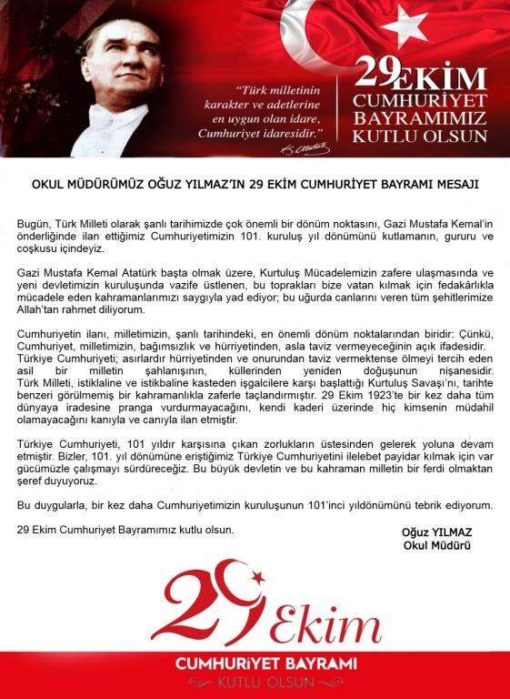 Okul Müdürümüz Oğuz Yılmaz'ın 29 Ekim Cumhuriyet Bayramı Mesajı