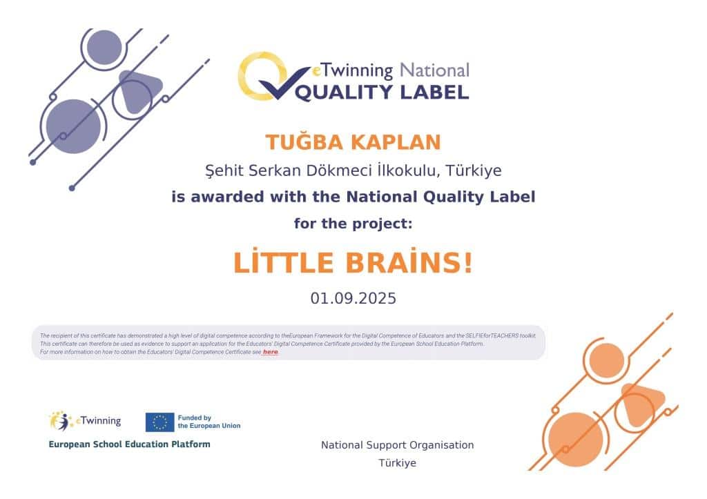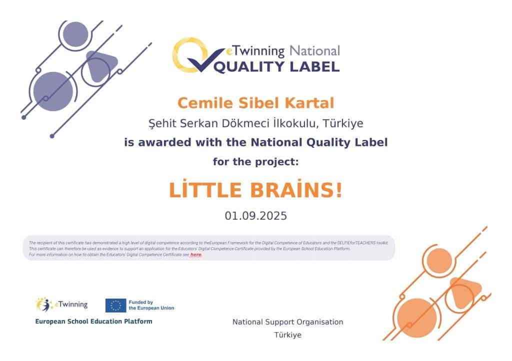 Okulumuz 2C ve 2D sınıf öğretmenleri Cemile Sibel Kartal, Tuğba Kaplan ve öğrencilerinin katıldıkları "Little Brains" adlı eTwinnin projesi Ulusal Kalite Etiketi ile ödüllendirildi.